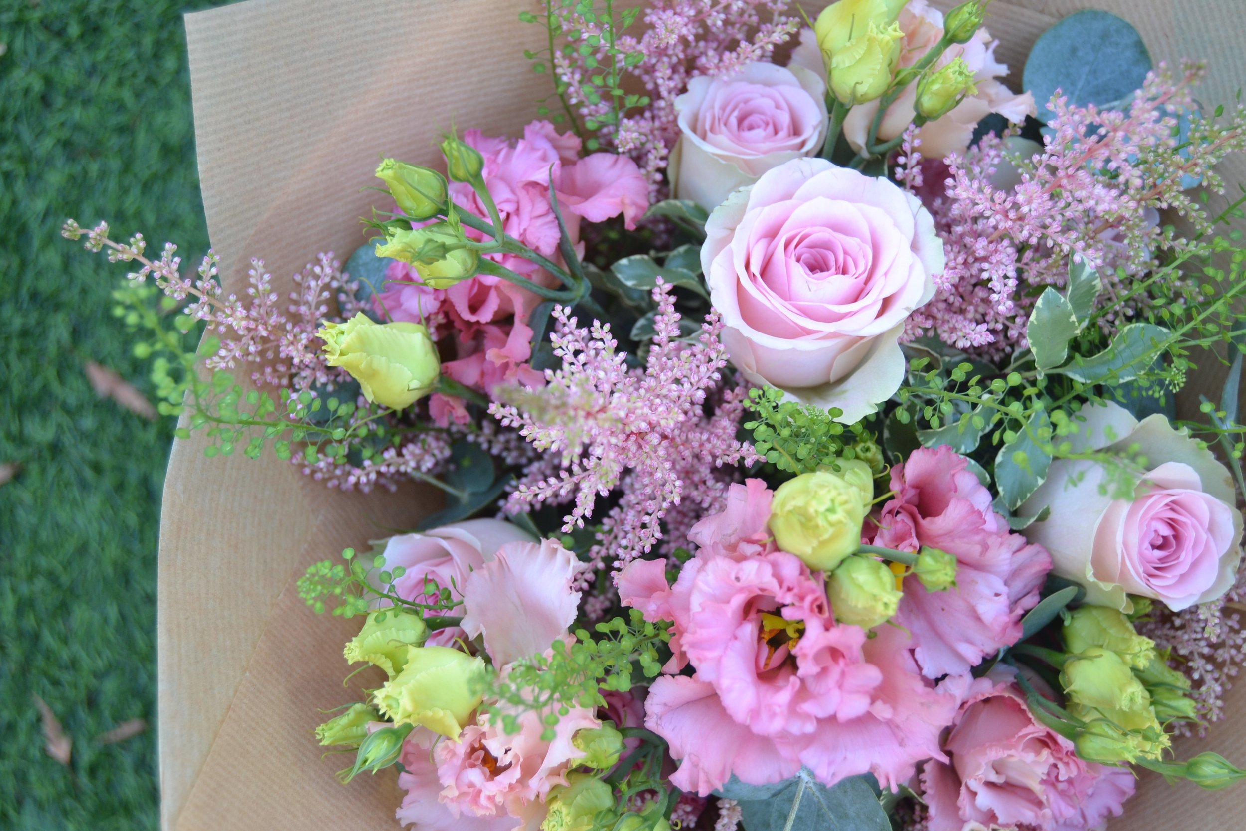 Bouquet of pink roses, pink lisianthus, pink astilbe, and greenery wrapped in brown paper.