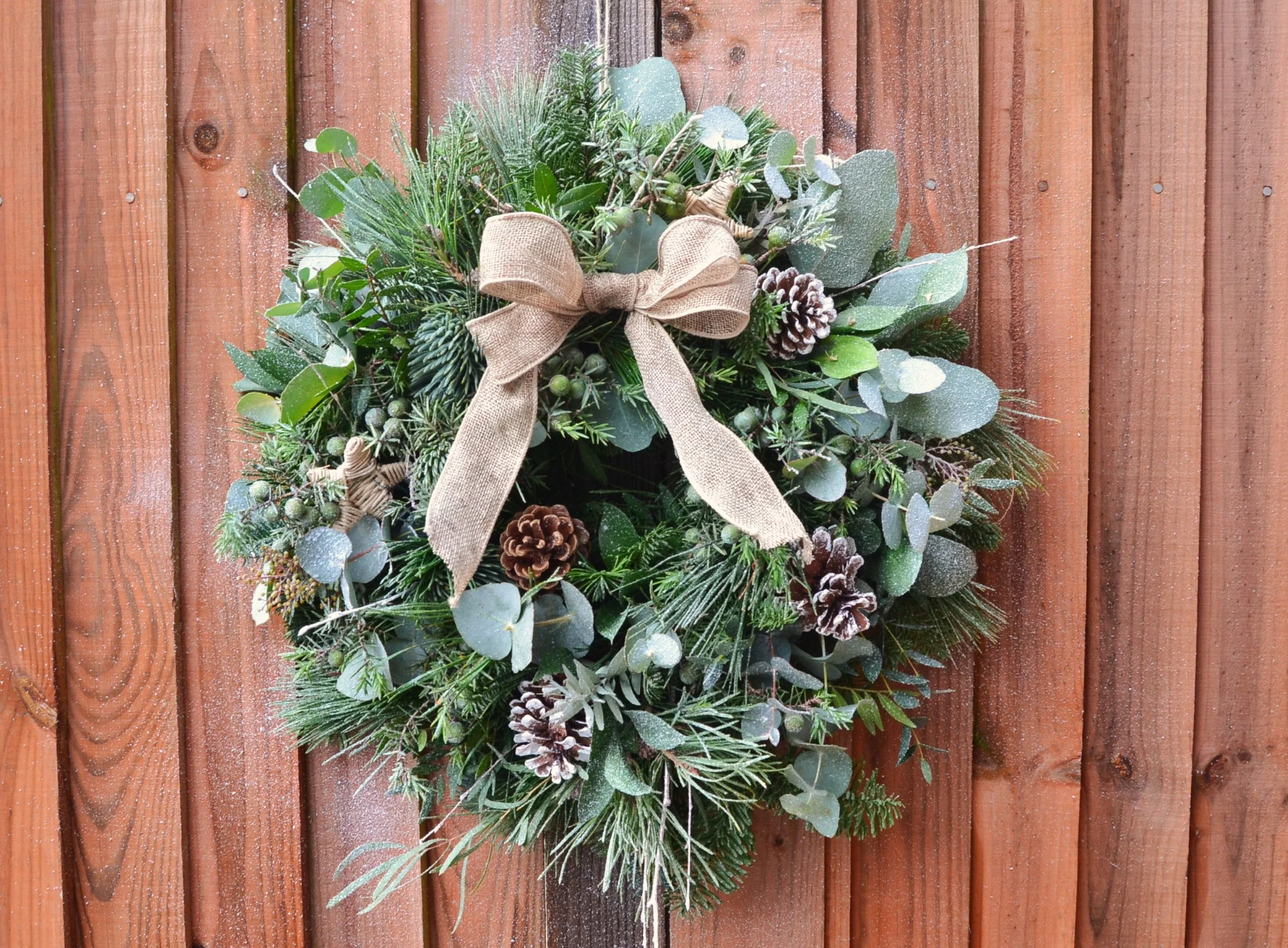 A Christmas wreath with pine, eucalyptus, pinecones, and a beige bow hanging on a wooden fence.